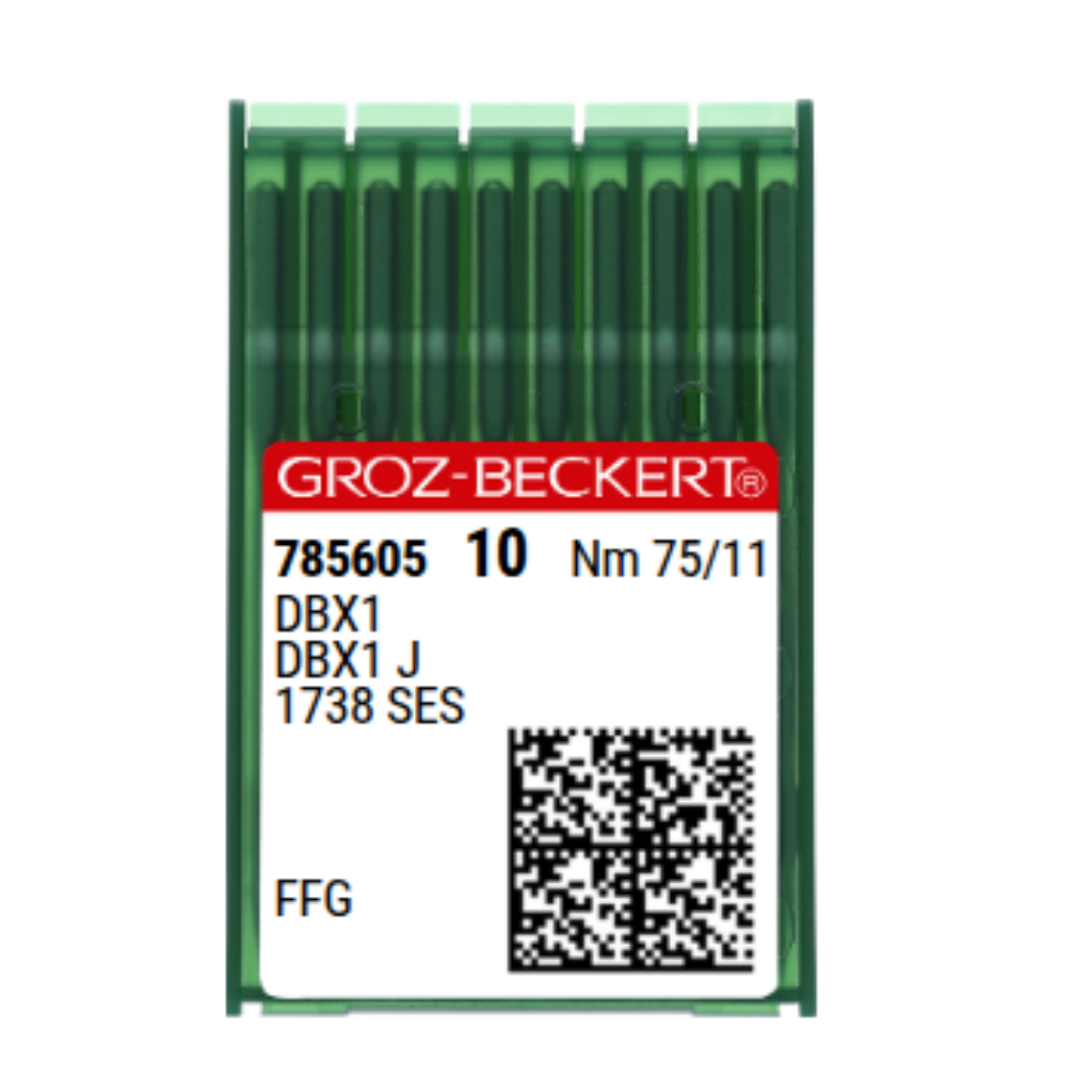 Agulha Groz-Beckert B27 75/11 FFG – ideal para máquinas de costura reta industrial. Ponta esférica fina, costura delicada e precisa em malhas e tecidos leves.
